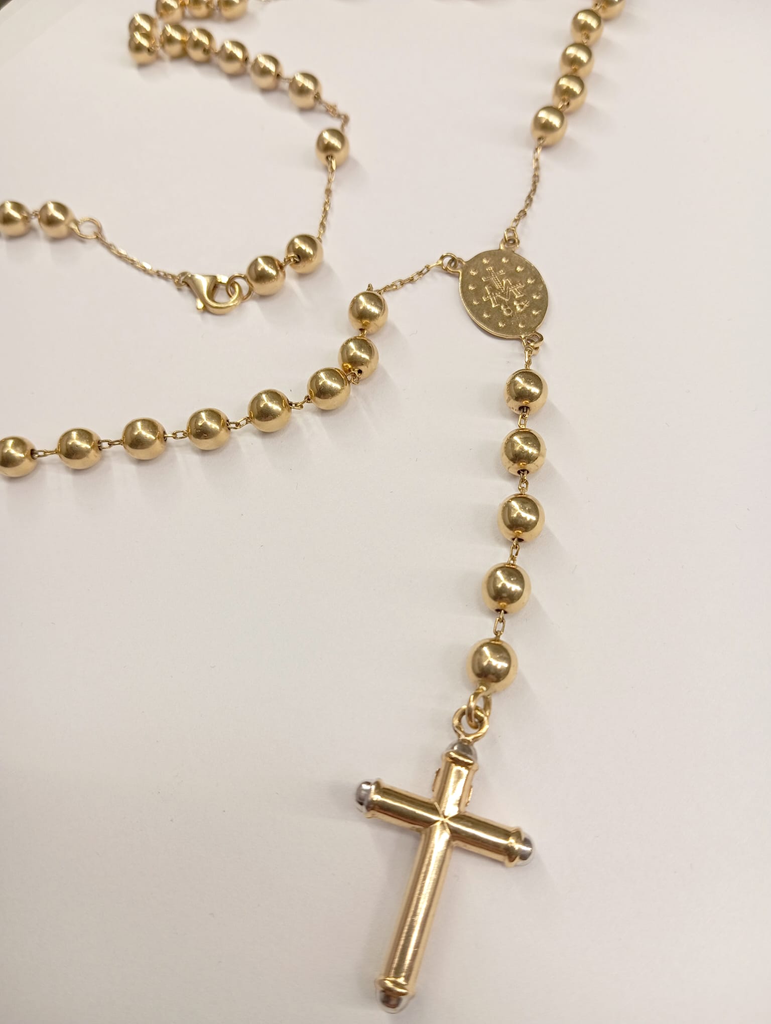Złoty różaniec w próbie 585. Próba wybita na zapięciu łańcucha.